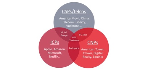 Ovum報(bào)告中將通信提供商(Communications Provider,CP)劃分為三個(gè)大類(lèi):固定和移動(dòng)CSP(Telco)、ICP和運(yùn)營(yíng)商中立提供商(Carrier-neutral Providers,CNP)--后者代表塔公司和數(shù)據(jù)中心托管商,如American Tower公司(紐交所:AMT)或Equinix公司(納斯達(dá)克:EQIX)。