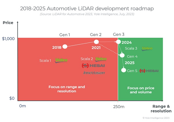 中國的原始設備制造商(OEM)顯然正在推動將激光雷達集成到他們的車輛中。雖然歐盟或美國OEM將激光雷達限制在F級,但中國OEM現(xiàn)在正在推出D級汽車。這些車比F級車便宜得多,而且產量也高得多,因此將催生激光雷達需求。Yole表示,超過25家不同的中國OEM正在他們的汽車上安裝激光雷達。
