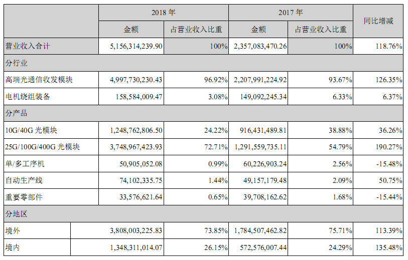 分產(chǎn)品來看,10G/40G光模塊營收12.49億元,同比增長36.26%,毛利率24.36%,占總營收24.22%;25G/100G/400G光模塊營收37.49億元,同比增長190.27%,毛利率28.16%,占總營收72.71%。國內(nèi)外營收占比分別為73.85%和26.15%。2018年,高端光通信收發(fā)模塊總生產(chǎn)450萬只,總銷售出貨422萬只。