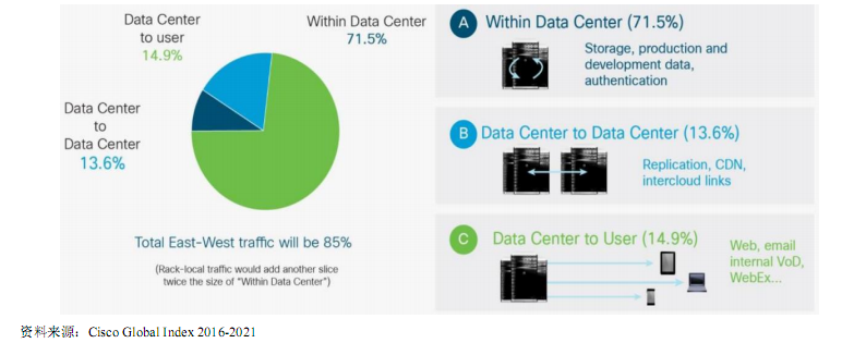 根據(jù)思科(Cisco)公司預(yù)測(cè),全球超大型數(shù)據(jù)中心數(shù)量預(yù)計(jì)由2016年的338個(gè)增長至2021年的628個(gè)(占比達(dá)53%),復(fù)合年增長率達(dá)13%;全球數(shù)據(jù)中心總流量將由2016年的6819EB增至2021年的20555EB,復(fù)合年增長率達(dá)23%,由數(shù)據(jù)中心內(nèi)部流量和數(shù)據(jù)中心互聯(lián)流量組成的東西向流量(East-West Traffic,橫向流量)占數(shù)據(jù)中心總流量約85%。
