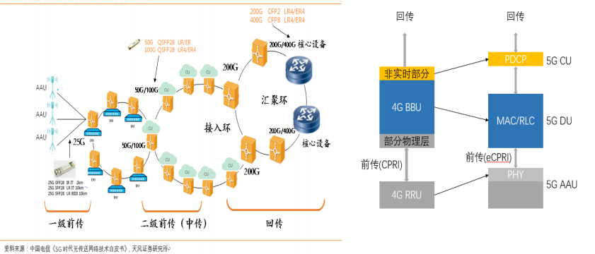 5G網(wǎng)絡(luò)所提供的多類業(yè)務(wù)的主要特征包括大帶寬、低延時(shí)、海量連接等從而對(duì)承載網(wǎng)提出了大寬帶、低延時(shí)、高精度時(shí)間同步、靈活組網(wǎng)、網(wǎng)絡(luò)切片的要求。5G承載網(wǎng)將從4G時(shí)期的兩級(jí)結(jié)構(gòu)演化到三級(jí)結(jié)構(gòu),衍生出前傳、中傳和回傳網(wǎng)絡(luò)三部分。同時(shí),5G網(wǎng)絡(luò)頻譜相對(duì)4G網(wǎng)絡(luò)更高,造成基站密度大幅增加。由此衍生,5G網(wǎng)絡(luò)的建設(shè)相較4G時(shí)代提升了對(duì)光模塊產(chǎn)品的數(shù)量需求、速率要求,要求的傳輸距離也會(huì)越來越遠(yuǎn)。目前5G前傳網(wǎng)絡(luò)以25G光模塊產(chǎn)品為主;中傳或以50G PAM4為主;5G回傳或?qū)⑹褂?00G/200G/400G相干光模塊(高速長距)。據(jù)公開資料及中信建投證券研究報(bào)告預(yù)計(jì),中國5G光模塊市場(chǎng)規(guī)模預(yù)計(jì)將達(dá)到550億元,較4G時(shí)代180億元投資額增長206%。