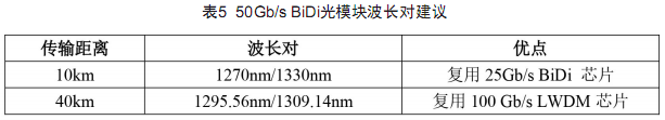 50Gb/s光模塊的典型傳輸距離在40km及以內(nèi),技術(shù)方案主要基于25G波特率的光芯片和脈幅調(diào)制(PAM4)調(diào)制格式,對高線性度激光器驅(qū)動器和跨阻放大器要求較高。目前IEEE 802.3cd已經(jīng)規(guī)范了傳輸距離為10km的單通道50Gb/s光接口,IEEE802.3cn正在規(guī)范傳輸距離為40km的50Gb/s光接口。50Gb/s 10km光模塊可采用25G波特率的DFB激光器和PIN探測器實(shí)現(xiàn);40km光模塊需采用25G波特率的EML激光器和APD探測器實(shí)現(xiàn)。對上下行時延對稱性要求較高的應(yīng)用場景可采用50Gb/s BiDi光模塊,相關(guān)標(biāo)準(zhǔn)IEEE 802.3cp正在規(guī)范,擬采用WDM技術(shù)方案,結(jié)合方案成本與供應(yīng)鏈成熟度考慮,具體波長對選擇建議如表5所示。