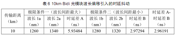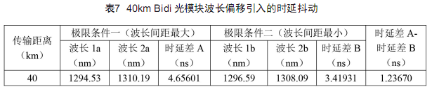 40km BiDi光模塊由于激光器采用溫度控制,波長偏移范圍略小,時延差最大變化量為1.23670ns,如表7所示。