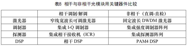 非相干DWDM彩光模塊的典型傳輸距離為40km及以內(nèi),目前主流方案采用PAM4技術(shù)。非相干50/100Gb/s光模塊采用固定波長DWDM激光器和PAM DSP芯片,相對于相干光模塊具有一定的成本優(yōu)勢,兩者關(guān)鍵器件的比較如表8所示。