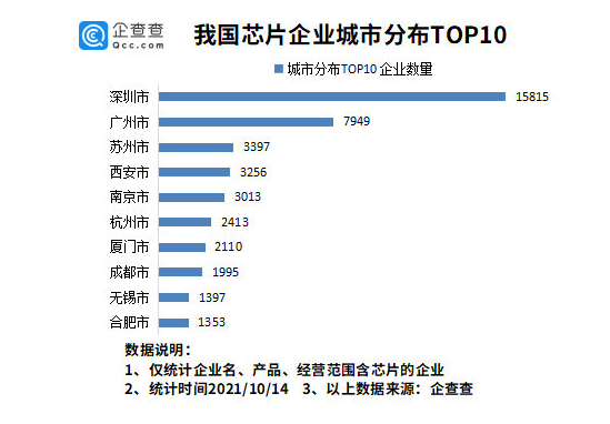 從城市分布來看,深圳市有 1.58 萬家芯片相關(guān)企業(yè),排名第一。廣州有芯片相關(guān)企業(yè) 7949 家,位列第二。蘇州 3397 家,排名第三。此后依次為西安市、南京市、杭州市等。