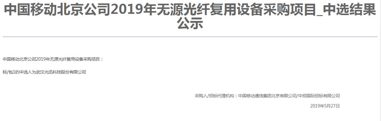 ICCSZ訊 (編輯:Nicole)中國移動北京公司2019年無源光纖復(fù)用設(shè)備采購項目中選結(jié)果出爐,由武漢光迅科技股份有限公司獨家中標。