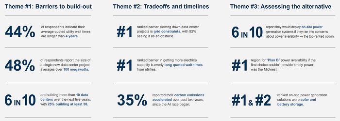 調(diào)查顯示,92%的受訪者將電網(wǎng)限制列為新建數(shù)據(jù)中心的首要障礙。其中,電力擴(kuò)容的漫長(zhǎng)等待期最為突出——近半數(shù)運(yùn)營(yíng)商報(bào)告等待時(shí)間超過(guò)4年。"這些開創(chuàng)性發(fā)現(xiàn)揭示了能源需求危機(jī)的廣度和深度,"AlphaStruxure CEO Juan Macias表示,"電網(wǎng)壓力疊加、能源價(jià)格上漲和經(jīng)濟(jì)機(jī)會(huì)流失,很快將對(duì)普通消費(fèi)者產(chǎn)生顯著影響。"