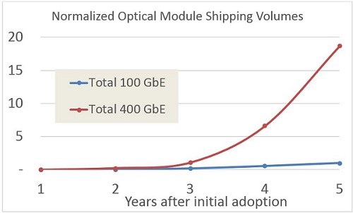 最佳的市場選擇是以可接受的成本批量供應(yīng)。一旦模塊封裝模式成功融合,400GbE的推出將受益于供應(yīng)商中所有貢獻者和多個競爭者的優(yōu)化。我們不能重復(fù)CFP4的教訓(xùn),僅僅為了追求一種毫無根據(jù)的短期風(fēng)險降低。