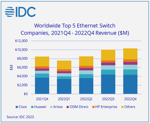 Arista Networks:以太網(wǎng)交換機(jī)收入在第四季度同比增長63.6%,全年增長55.4%,截至2022年底的市場份額為9.9%。