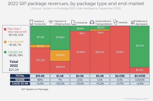 細(xì)分市場來看,移動和消費主導(dǎo)SiP市場,占2022年總收入的89%,且未來將繼續(xù)主導(dǎo)市場,年復(fù)合增長率為6.5%。驅(qū)動該細(xì)分市場的動力包括:2.5D/3D技術(shù)在手機(jī)、高端PC和游戲領(lǐng)域的日益普及,高端手機(jī)設(shè)備的高清FO,以及手機(jī)和可穿戴設(shè)備中更多的FC/WB SiP。電信和基礎(chǔ)設(shè)施市場預(yù)計將在未來幾年增長20.2%,驅(qū)動力包括AI、HPC和網(wǎng)絡(luò)領(lǐng)域不斷提高的性能要求。汽車市場正在以15.3%的年復(fù)合增長率增長,驅(qū)動力包括汽車電氣化和自動駕駛趨勢,也包括ADAS和LiDAR等應(yīng)用,這些應(yīng)用需求更多數(shù)量的傳感器和攝像頭。