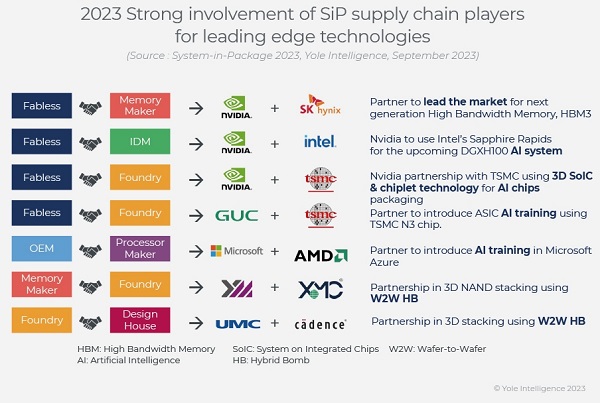 在小芯片、異構(gòu)集成、成本優(yōu)化和占地面積減少趨勢的推動下,SiP吸引了更多的參與者進(jìn)入供應(yīng)鏈?zhǔn)袌?。芯片和?nèi)存廠商、無晶圓廠和代工廠/內(nèi)存廠商之間的合作模式越來越多,以引入HBM3、AI產(chǎn)品、小芯片技術(shù)和混合鍵合等前沿技術(shù)。