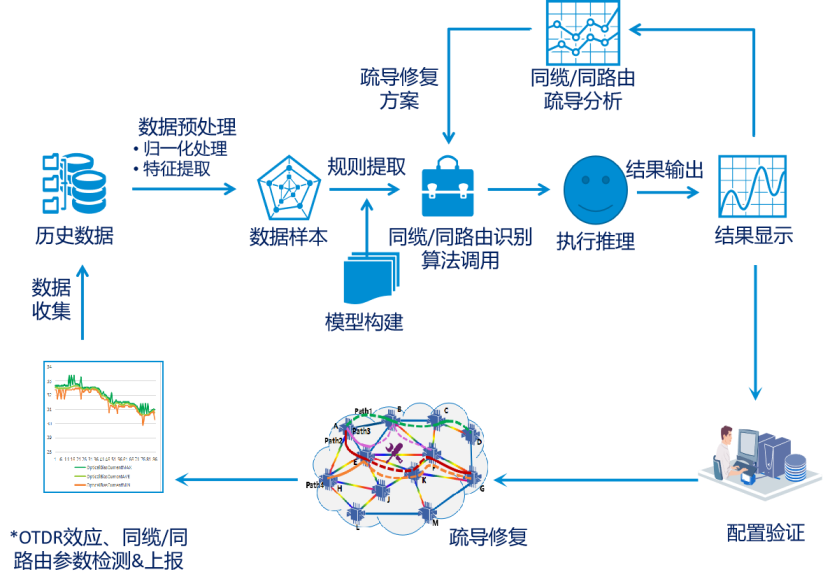 通過分析光纖的特征數(shù)據(jù),如瑞利散射效應、布里淵散射效應、拉曼散射效應、光偏振變化等數(shù)據(jù),精準識別OTN網(wǎng)絡中保護路徑的同纜情況,并在此基礎上支持邏輯同路由識別功能。通過OTDR檢測和AI分析識別OTN中的同纜/同路由信息,生成影響業(yè)務的SRLG信息。并將帶保護的路徑計算、重路由計算加入主動規(guī)避SRLG策略,可大幅提升新路由可靠性。