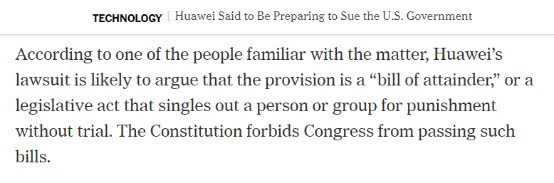 《紐約時(shí)報(bào)》還引述“消息人士”的說(shuō)法稱(chēng),華為準(zhǔn)備在法庭上的訴訟理由是認(rèn)為美國(guó)政府對(duì)華為的做法構(gòu)成了“剝奪公權(quán)法案”的情形,即該法案中的條款對(duì)華為構(gòu)成了明顯的 “未審先判”,而美國(guó)的憲法則禁止美國(guó)國(guó)會(huì)通過(guò)這樣的法律。