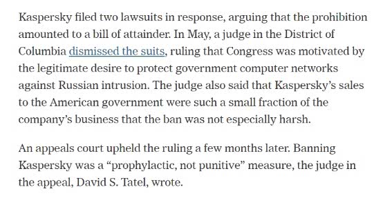 然而,卡巴斯基最終輸?shù)袅斯偎竞秃罄m(xù)的上訴。《紐約時(shí)報(bào)》稱(chēng),美國(guó)法院認(rèn)為政府封殺卡巴斯基的原因是為了保護(hù)美國(guó)的電腦系統(tǒng)不被俄羅斯人入侵,認(rèn)為美國(guó)國(guó)會(huì)通過(guò)法律封殺這家俄羅斯企業(yè)有足夠的合法性。