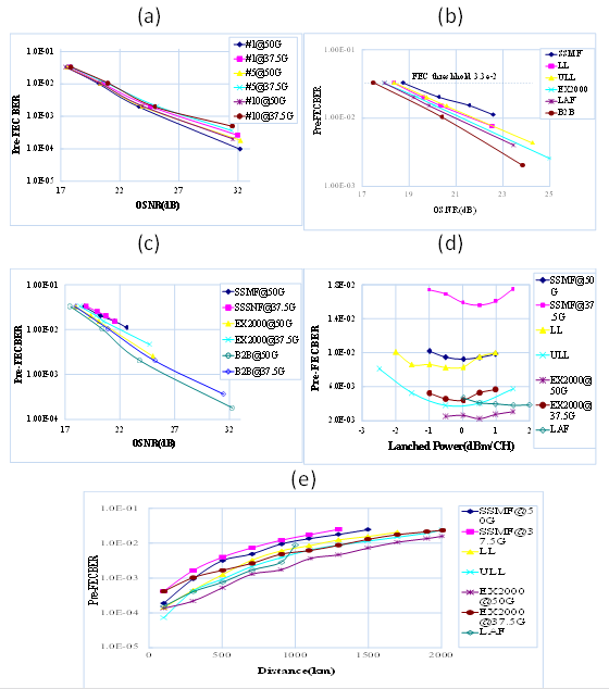 圖2(c)展示了1000km傳輸后普通單模光纖和EX2000光纖在50GHz和37.5GHz兩種柵格下的誤碼率曲線,主要目的在于研究靈活柵格對(duì)于傳輸?shù)挠绊憽T贔EC門限處,37.5GHz相比50GHz的代價(jià)對(duì)于兩種光纖都是0.4dB左右。這也證明對(duì)于超100G系統(tǒng)長(zhǎng)距離傳輸,靈活柵格是可以使用的。圖2(d)展示了1000km傳輸后不同光纖的誤碼率和入纖功率的曲線。其中,低損、超低損和大有效面積光纖是在50GHz柵格下測(cè)試,單模光纖和EX2000光纖在兩種柵格下都進(jìn)行了測(cè)試。在50GHz柵格下,大有效面積光纖的入纖功率最大,EX2000其次。37.5GHz柵格下入纖功率略小,這是因?yàn)楦o密的通道會(huì)帶來更大的非線性噪聲。圖2(e)展示了不同光纖在50GHz柵格下,F(xiàn)EC糾錯(cuò)前誤碼率和傳輸距離的關(guān)系。和前面一樣,單模光纖和EX2000光纖在兩種柵格下都進(jìn)行了測(cè)試。其中大有效面積光纖只進(jìn)行了1000km的測(cè)試,因?yàn)檫@種光纖只準(zhǔn)備了1000km。在各個(gè)距離下,大有效面積、超低損和EX2000光纖具有最好的誤碼率性能。其中,超低損和EX2000光纖在50GHz和37.5GHz兩種柵格下都傳輸了2000km的距離,并且還沒有達(dá)到FEC門限的誤碼率,這表示兩種光纖還有潛力可以傳輸更遠(yuǎn)。同時(shí),不同光纖的系統(tǒng)在不同柵格下都在所能傳輸?shù)臉O限距離進(jìn)行了長(zhǎng)時(shí)間測(cè)試,24小時(shí)之內(nèi)均保持FEC糾錯(cuò)后誤碼率為0的性能,這也代表測(cè)試中400G系統(tǒng)的成熟度。