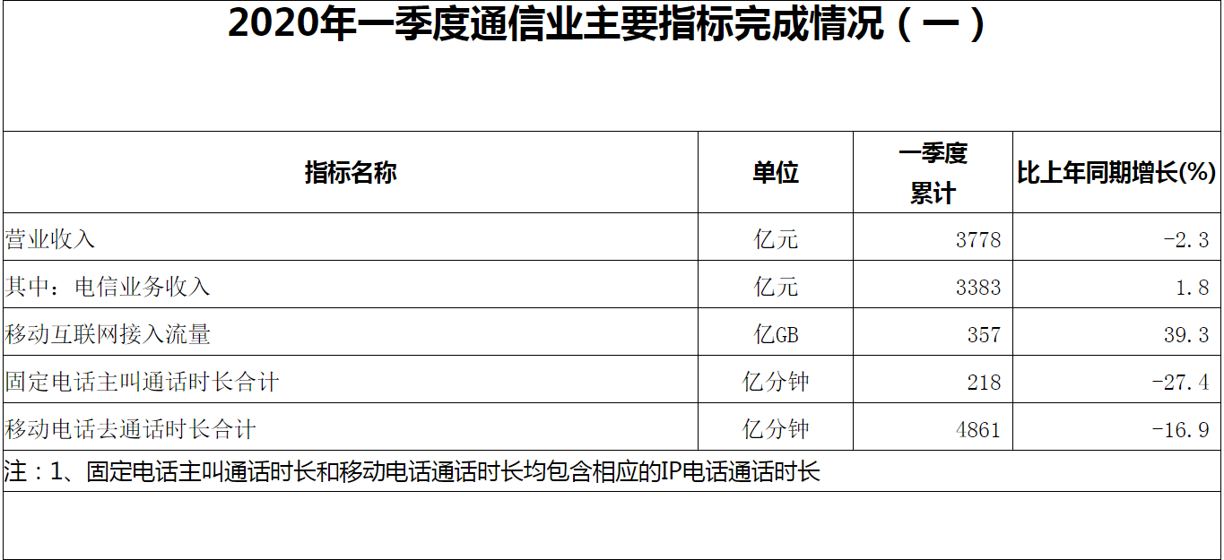 ICC訊(編輯:Anton)近日據(jù)工信部運行監(jiān)測協(xié)調(diào)局?jǐn)?shù)據(jù),2020年一季度通信業(yè)累計營收3778億元,比上年同期下降2.3%。其中,電信業(yè)務(wù)收入小幅提升,累計完成3383億元,同比增長1.8%。