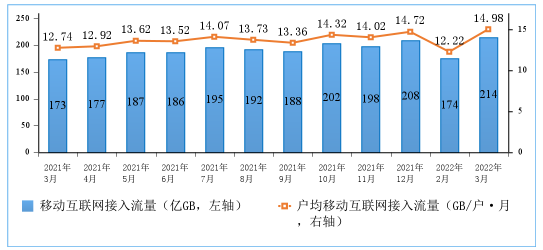 2022年一季度,我國移動互聯(lián)網(wǎng)累計接入流量達587億GB,同比增長21.8%。截至3月末,移動互聯(lián)網(wǎng)用戶數(shù)達14.4億戶,比上年末凈增1985萬戶。