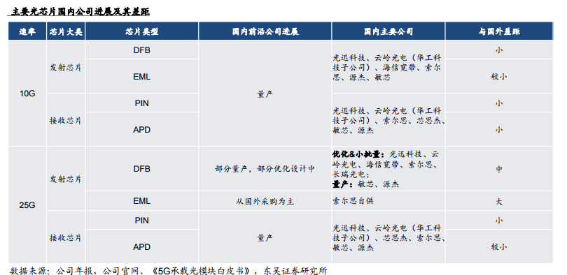 從圖表就可以看出來,目前國產(chǎn)光芯片與國外差距比較大的就是25G的發(fā)射芯片領(lǐng)域,或許這也是華為為什么要自研光芯片的原因之一。