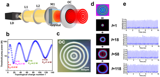 圖1 多渦旋激光器的設(shè)計(jì)以及多渦旋光束產(chǎn)生。a, 多渦旋激光器示意圖;b,多渦旋振蕩閾值極值分析法設(shè)計(jì)實(shí)例;c, 輸出耦合鏡表面打印的圖案;d,產(chǎn)生的多渦旋光束的光斑圖樣;e, 各個渦旋態(tài)的鎖模脈沖序列。