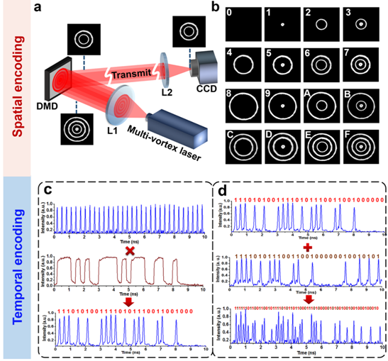 圖2 多渦旋激光器的空間與時間編碼。a, 多渦旋激光器信息傳輸示意圖;b,多渦旋光束十六進(jìn)制編碼;c,渦旋光束的時間編碼;d,渦旋光束的時分復(fù)用。
