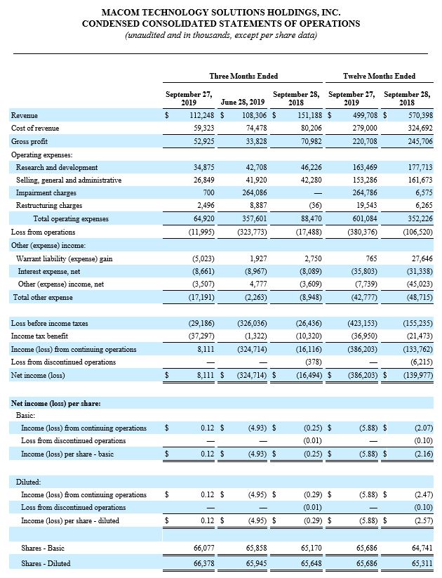 ICCSZ訊 11月12日,領(lǐng)先的半導(dǎo)體供應(yīng)商MACOM公司(納斯達克:MTSI)公布了其截至2019年9月27日第四財季及全年的財務(wù)數(shù)據(jù)。其中,第四財季,MACOM收入為1.122億美元,環(huán)比增長4%,同比下降26%。同比下降主要是由于數(shù)據(jù)中心需求疲軟和PON銷售下降所致。而2019財年,MACOM收入為4.997億美元,同比下降12.4%;毛利率為44.2%,而2018財年為43.1%。