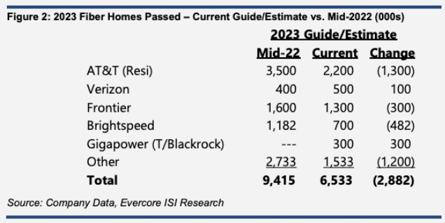 Evercore分析師曾預測,美國光纖服務供應商計劃在2023年期間總共新建940萬個地點,但現(xiàn)在他們預計這一數(shù)字將在650萬左右。