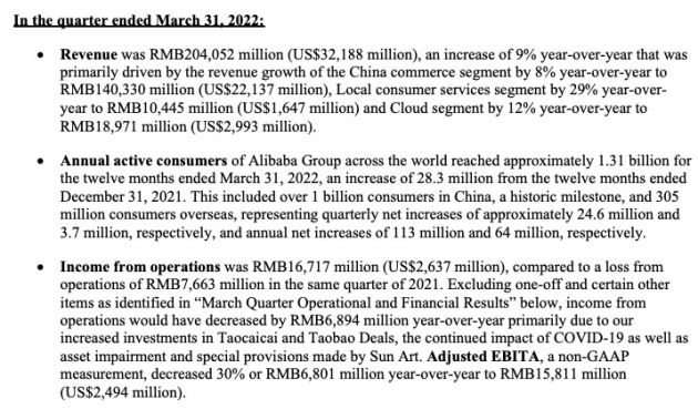 ICC訊 5月26日消息,阿里巴巴對外發(fā)布截至2022年3月31日的2022財年第四季度業(yè)績及2022財年業(yè)績,數(shù)據(jù)顯示,阿里巴巴2022財年第四季度營收2040.5億元,預(yù)估2005.9億元,同比增長9%,高于市場預(yù)期。四季度歸屬于普通股股東的凈虧損為162.41億元。四季度非美國通用會計準(zhǔn)則下凈利潤為197.99億元。