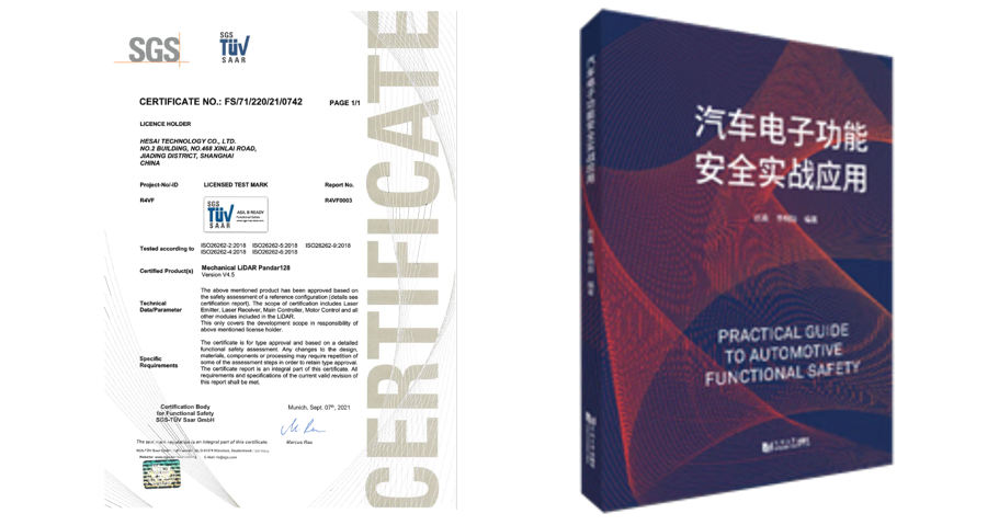 在積極推動車載激光雷達相關標準制定的同時,禾賽也持續(xù)深耕激光雷達安全領域,步步先行。在功能安全方面,禾賽推出了全球首款獲得 ISO 26262 ASIL B 功能安全產品認證的激光雷達。為造就這款“持證上崗”的激光雷達產品,禾賽引入第三方權威認證公司德國 SGS-TüV 對產品進行全流程深度考察,經過近萬條失效分析、300 多份工作成果和28 個月的數輪迭代,實現(xiàn)了滿足標準要求的安全保障。此外,禾賽還出版了全國首本汽車電子功能安全書籍《汽車電子功能安全實戰(zhàn)應用》,由禾賽安全質量工程部總監(jiān)主編、禾賽安全團隊及業(yè)界專家共同編寫。