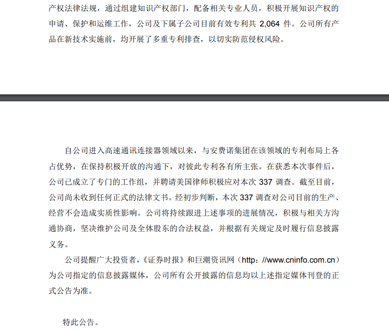 公告表示,自公司進(jìn)入高速通訊連接器領(lǐng)域以來,與安費(fèi)諾集團(tuán)在該領(lǐng)域的專利布局上各占優(yōu)勢,在保持積極開放的溝通下,對(duì)彼此專利各有所主張。在獲悉本次事件后,公司已成立了專門的工作組,并聘請(qǐng)美國律師積極應(yīng)對(duì)本次337調(diào)查。截至目前,公司尚未收到任何正式的法律文書。經(jīng)初步判斷,本次337調(diào)查對(duì)公司目前的生產(chǎn)、經(jīng)營不會(huì)造成實(shí)質(zhì)性影響。