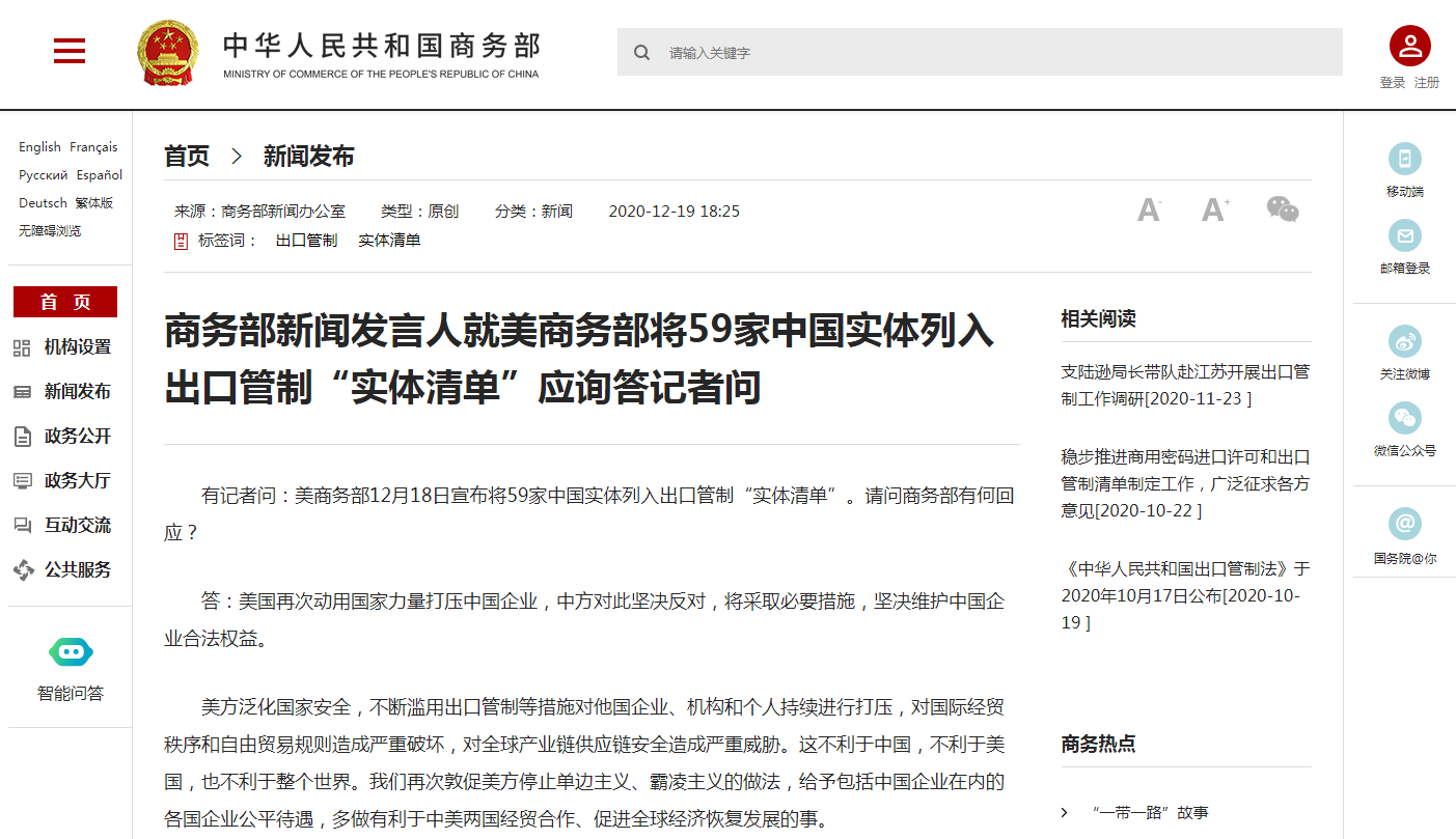對(duì)此,中國商務(wù)部新聞發(fā)言人就美商務(wù)部將59家中國實(shí)體列入出口管制“實(shí)體清單”也進(jìn)行了答記者問。