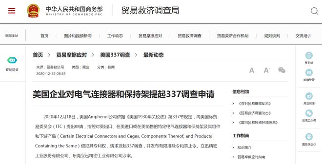 公告指明,近日立訊精密從美國國際貿(mào)易委員會(huì)網(wǎng)站獲悉,安費(fèi)諾集團(tuán)于12月18日根據(jù)《美國1930年關(guān)稅法》第337節(jié)規(guī)定向美國國際貿(mào)易委員會(huì)提出調(diào)查申請(qǐng)。