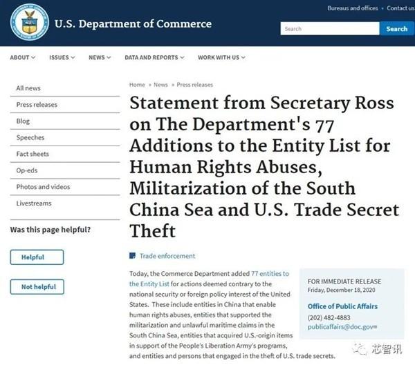 ICC訊(編輯:Debi)美國當(dāng)?shù)貢r(shí)間12月18日晚間,美國商務(wù)部正式宣布將中芯國際及其子公司等59家中國實(shí)體企業(yè)列入“實(shí)體清單”,而近日美國商務(wù)部正式公布了最新被列入實(shí)體清單的77家實(shí)體,該名單于22日正式執(zhí)行: