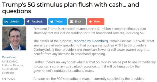 FCC最近給這個(gè)項(xiàng)目貼上了20億美元的標(biāo)簽,這意味著它可能只占特朗普報(bào)告的刺激方案的0.2%。但對特朗普來說,一個(gè)刺激計(jì)劃,可以讓美國的通信更安全,尤其是在農(nóng)村地區(qū),同時(shí)讓中國的競爭對手受挫。分析師表示,人們有理由認(rèn)為,特朗普和他的顧問團(tuán)隊(duì)可以利用5G、中國和經(jīng)濟(jì)衰退來傳達(dá)他們在選舉年的政治優(yōu)勢信息。