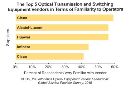 IHS調(diào)查的服務供應商占全球電信資本開支的35%,調(diào)查中提名的設備商包括ADVA、阿爾卡特朗訊、BTI、Ciena、思科、Coriant、Cyan、ECI、愛立信、富士通、華為、Infinera、NEC、Transmode和中興。