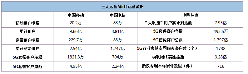 ICC訊 近日三大運(yùn)營商發(fā)布了5月份的運(yùn)營數(shù)據(jù)報(bào)告。在5G 套餐用戶方面,5G套餐客戶數(shù)凈增1821.3萬戶,累計(jì)達(dá)到4.95億戶。中國電信5G套餐用戶凈增704萬戶,5G套餐用戶數(shù)累計(jì)2.24億戶。中國聯(lián)通5月5G套餐用戶新增數(shù)量493.6萬戶,累計(jì)達(dá)到1.797億戶。三家5G套餐用戶數(shù)量累計(jì)達(dá)到8.987億。5月中國移動(dòng)的5G用戶增速最快。