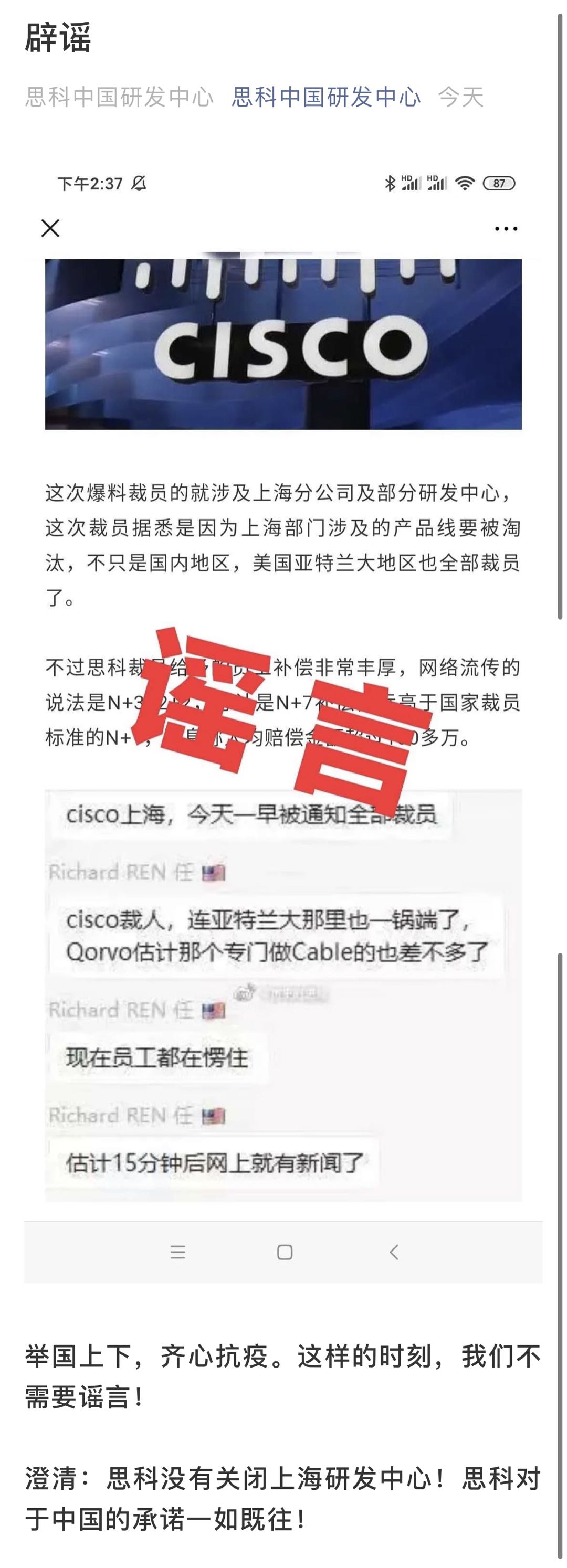 ICCSZ訊 思科中國(guó)研發(fā)中心公眾號(hào)發(fā)布辟謠稱,并沒有關(guān)閉上海研發(fā)中心,思科對(duì)于中國(guó)的承諾一如既往。