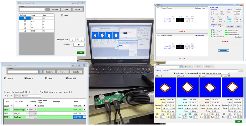 第二種方案為唐領(lǐng)科技的低成本CBT135高速數(shù)據(jù)線測試系統(tǒng),這是一個完全針對產(chǎn)線測量的集成式測試系統(tǒng)。它會測量HDMI AOC的功耗狀況,監(jiān)控I2C、CEC等低速信號的通斷,同時測試各個通道眼圖參數(shù)和余量(build in Mask),也可以添加誤碼測試功能。工程模式下將測試流程設(shè)置好之后,生產(chǎn)模式一鍵式服務(wù),并保存測試報告上傳到數(shù)據(jù)庫。在Source和Sink端有相對應(yīng)的均衡進行調(diào)整模擬正式傳輸環(huán)境,讓測試更接近現(xiàn)實應(yīng)用。整個測試過程大概10秒以內(nèi),無需繁瑣的射頻線纜連接,可拔插夾具并自動統(tǒng)計監(jiān)控HDMI線纜拔插次數(shù)進行次數(shù)預(yù)警。