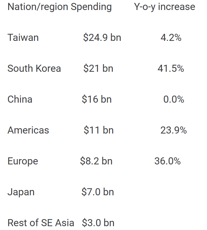2024年前端晶圓廠設(shè)備支出國家/地區(qū)排名