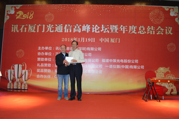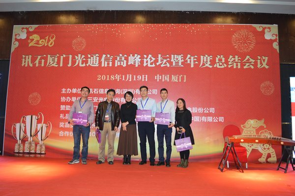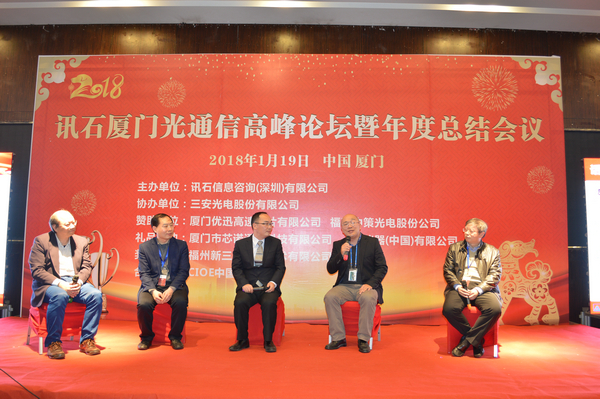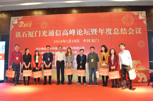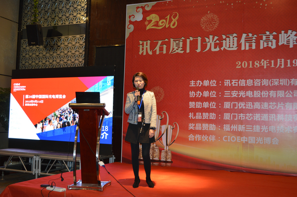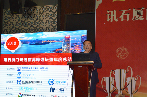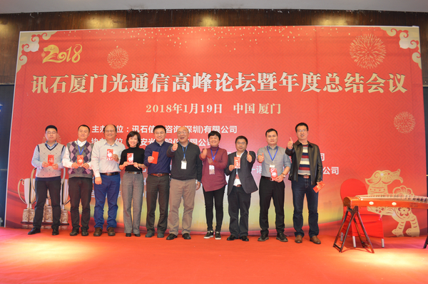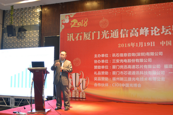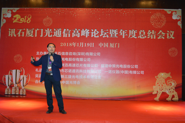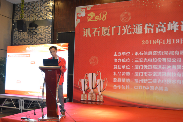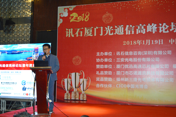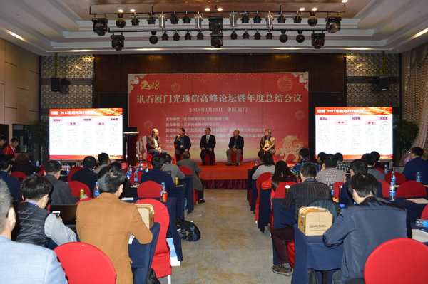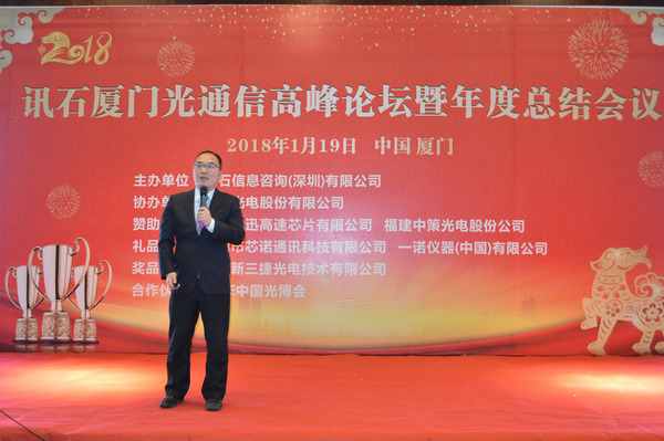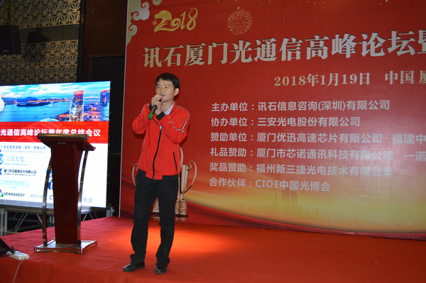 Iccsz訊 白駒過(guò)隙,時(shí)光荏苒,2017年已經(jīng)結(jié)束,我們迎來(lái)嶄新的2018年!正逢新年喜慶,1月19日《2018訊石廈門(mén)光通信高峰論壇暨年度總結(jié)會(huì)議》在廈門(mén)成功舉辦,145家企業(yè)超過(guò)280人齊聚廈門(mén),歡度訊石2017尾牙,展望全球2018!本次會(huì)議由訊石信息咨詢(xún)(深圳)有限公司主辦、三安光電股份有限公司協(xié)辦,廈門(mén)優(yōu)迅高速芯片有限公司和福建中策光電股份公司支持,論壇圍繞光通信模塊、器件、芯片和材料等議題展開(kāi),多位光通信行業(yè)大咖先后向觀眾講述市場(chǎng)動(dòng)態(tài)和技術(shù)發(fā)展。還要感謝廈門(mén)市芯諾通訊有限公司、一諾儀器(中國(guó))有限公司、福州新三捷光電技術(shù)有限公司和CIOE中國(guó)光博會(huì)對(duì)本次論壇提供的幫助,大家一起將論壇氛圍推向高峰。