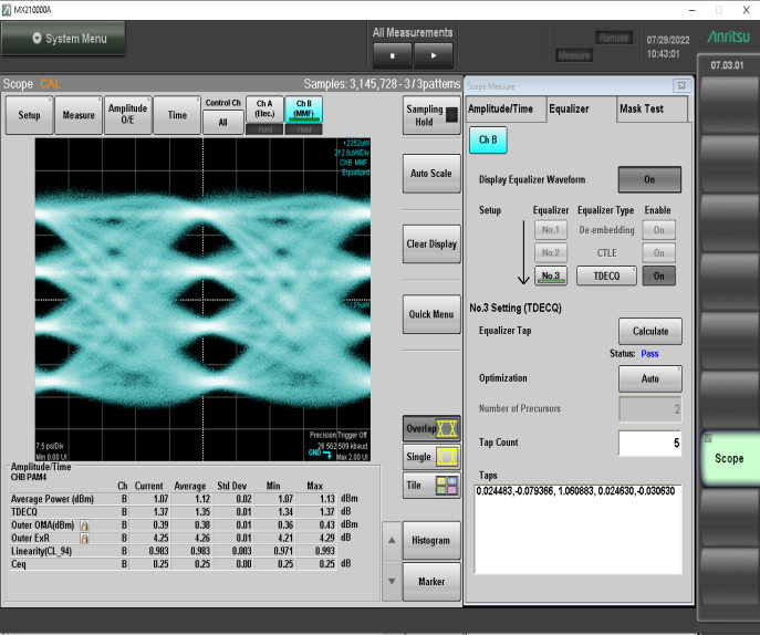 新上市的200G QSFP56 SR4/AOC基于博通4X50G PAM4 7nm DSP。光口類(lèi)型為MPO12(APC),測(cè)試常溫和高溫眼圖TDECQ在1db左右,三溫最大功耗為4.65W,OMA靈敏度在-8dbm左右。