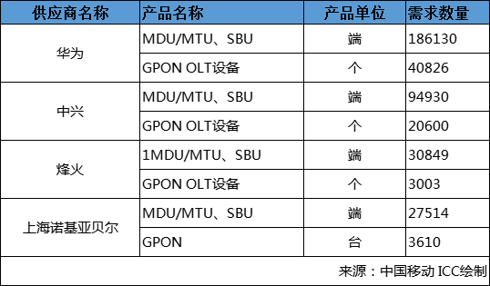 中移動PON設備集采(包1):華為、中興、烽火、諾基亞四廠家中標