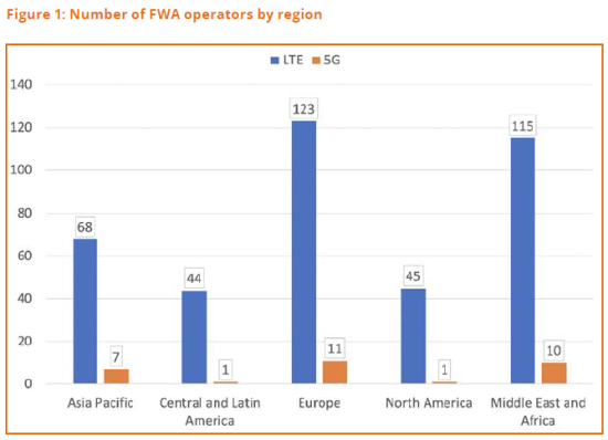 采用LTE或5G提供FWA服務(wù)的運(yùn)營(yíng)商數(shù)量因地區(qū)而已。歐洲的FWA運(yùn)營(yíng)商比其他任何地區(qū)都要多,其次是中東和非洲。