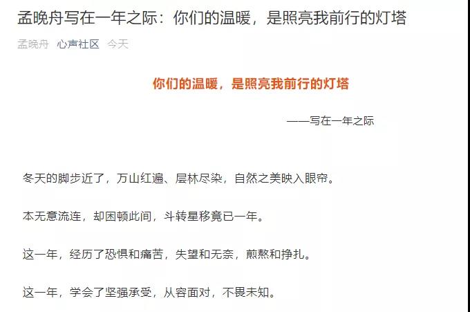 ICCSZ訊 (編輯:Nicole) 2019年12月2日,是孟晚舟被加拿大拘押一周年的日子。華為“心聲社區(qū)”發(fā)布了一封孟晚舟12月1日寫的公開信,感謝大家在這被拘押的一年里對她的支持和鼓勵。2018年12月2日,孟晚舟在溫哥華被加拿大警方逮捕。2019年9月24日,孟晚舟被非法拘押案再次開庭,其律師團(tuán)隊指控加拿大政府和美國。在公開信中,孟晚舟感謝大家對她的溫暖和鼓勵,“親愛的你們,這些溫暖都是照亮我前行的燈塔!”