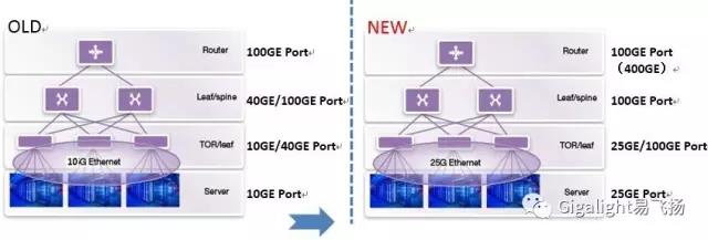 數(shù)據(jù)中心對于以太網(wǎng)的需求,來自兩個最重要的考量,一個是節(jié)能,一個是成本。與數(shù)據(jù)中心發(fā)展相關(guān)的領(lǐng)域,包括了“云”的發(fā)展,以及 Leaf/Spine矩陣式網(wǎng)絡(luò)架構(gòu)。隨著服務(wù)器性能的進(jìn)一步提升,也隨著數(shù)據(jù)中心內(nèi)從leaf到spine層連接在向100Gbps升級,那么服務(wù)器從現(xiàn)有的10Gbps向25Gbps/50Gbps升級已經(jīng)很有現(xiàn)實(shí)意義:因?yàn)?0G的以太網(wǎng)速度標(biāo)準(zhǔn)往往滿足不了需求,而100G又太貴了,25G和 50G以太網(wǎng)標(biāo)準(zhǔn)的出現(xiàn)正好彌補(bǔ)了這兩者的不足。此外,25Gbps和50Gbps每通道技術(shù)將是未來100Gbps(4個25Gbps)和400Gbps(8個50Gbps)以太網(wǎng)標(biāo)準(zhǔn)的基礎(chǔ),因此業(yè)界普遍希望利用25G傳輸速率來替代現(xiàn)有的10Gbps速率。