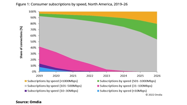 關(guān)于消費(fèi)者需求,Omdia預(yù)測(cè),到2026年,將有6700萬消費(fèi)者訂閱500Mbit/s或更快的服務(wù),高于2021年的1600萬。這一增長源于更多人永久在家工作以及在線游戲和直播的增加。