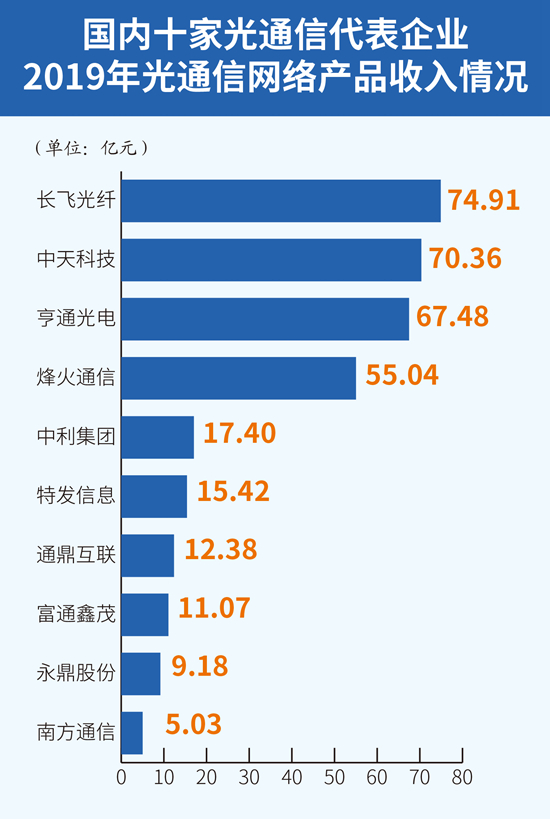 不過也有3家企業(yè)保持了一定幅度的增長,其中中天科技2019年營收同比上漲14.29%,永鼎股份和烽火通信分別上漲4.65%和1.76%。而在光通信網(wǎng)絡(luò)產(chǎn)品板塊,長飛光纖以74.91億元的收入繼續(xù)領(lǐng)銜光通信廠商。