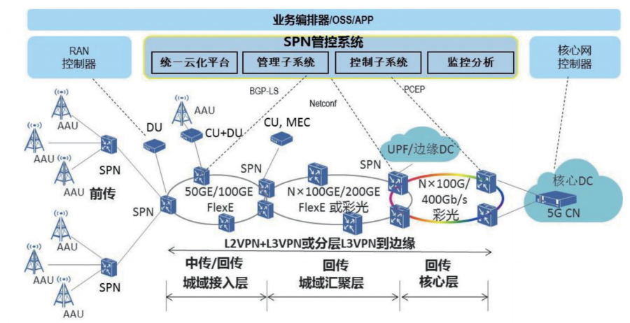 面向5G承載的SPN組網(wǎng)架構(gòu)如圖1所示。SPN具備前傳、中傳和回傳的端到端組網(wǎng)能力,通過FlexE接口和切片以太網(wǎng)(Slicing Ethernet),通道支持端到端網(wǎng)絡(luò)硬切片,并下沉L3功能至匯聚層甚至綜合業(yè)務(wù)接入節(jié)點(diǎn)來滿足動(dòng)態(tài)靈活連接需求。