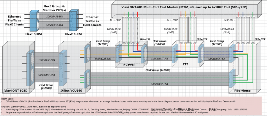 2018年1月,在VIAVI北京辦事處,VIAVI與華為、中興、烽火、Xilinx進(jìn)行了FlexE聯(lián)合測(cè)試,測(cè)試用例如圖所示,并成功在隨后的OFC上進(jìn)行功能展示。