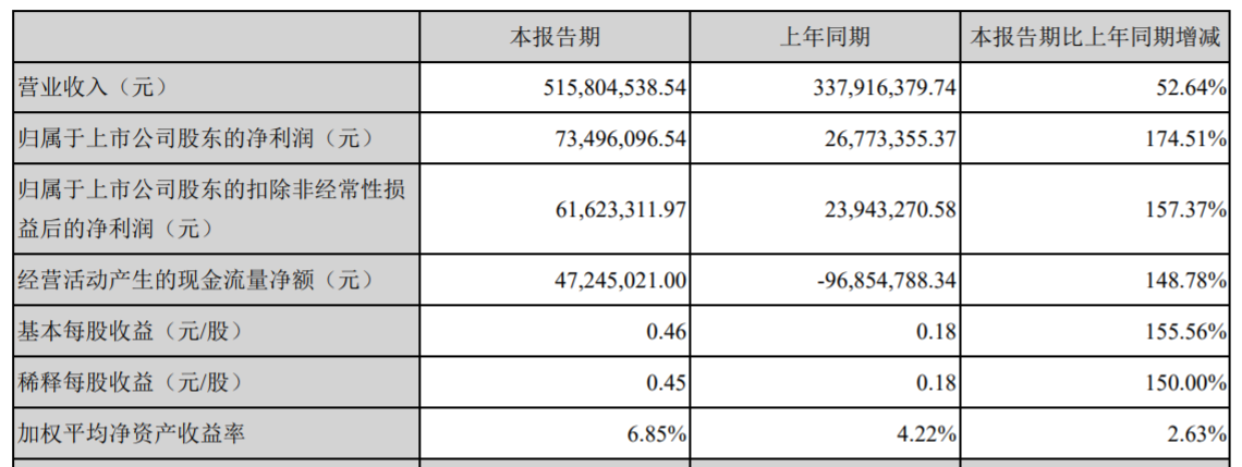ICC訊      (編輯:Nicole)   博創(chuàng)科技股份有限公司(以下簡稱“博創(chuàng)科技”或“公司”)發(fā)布2021 年半年度報告稱:2021年上半年公司實現(xiàn)營業(yè)收入5.16億元,比上年同期增長52.64%,實現(xiàn)凈利潤7,349.61萬元,比上年同期增長174.51%。