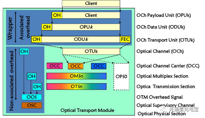如下圖所示,OTN將整個(gè)光層分為光通道層(OCH),光復(fù)用段層(OMS),光傳輸段層(OTS)。它們在光網(wǎng)絡(luò)中分別對應(yīng)的范圍如圖1,OCH指的是端到端的OTU之間部分,OMS指的是OMU和ODU之間,OTS指OLA與OLA之間。其中光通道層又分為三個(gè)子層:光通道數(shù)據(jù)單元(ODUk),光通道傳送單元(OTUk)及光通道凈荷單元(OPU)。